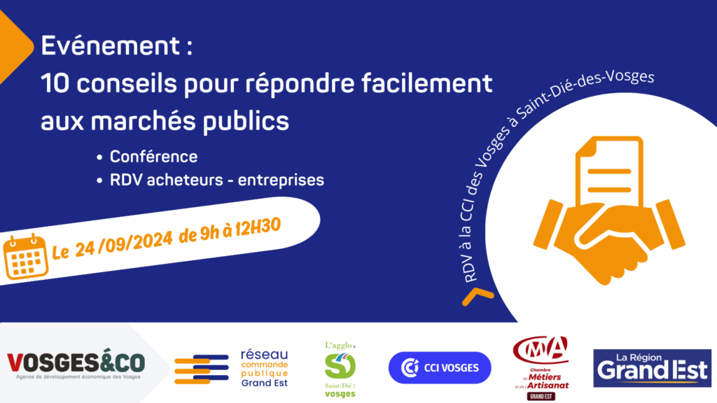 Ne manquez pas notre prochain événement de sensibilisation à l’achat public ! Organisé par l’agence de développement économique des Vosges, Vosges&co, en partenariat avec la Communauté d’Agglomération de Saint-Dié-des-Vosges, la CCI des Vosges et le Réseau Commande Publique Grand Est.